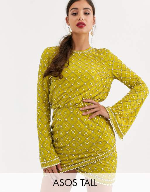 Asos Design Tall Mini Dress With Long Sleeve In Pearl And Beaded Embellishment Asos