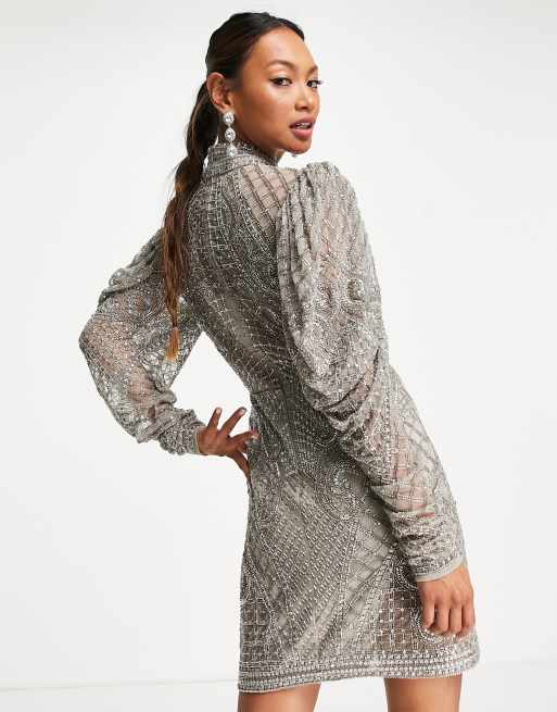 Asos Edition Crystal Beaded Mini Dress With Blouson Sleeve In Pale Grey Asos